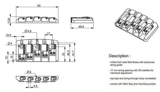 ABM/ABM3705C17 MkII 5弦ベース用 ベルブラスブリッジ 弦間17mm クローム / ベースパーツ ブリッジ