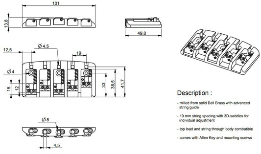 ABM/ABM3705CA19 MkII 5弦ベース用 アルミブリッジ 弦間19mm クローム / ベースパーツ ブリッジ