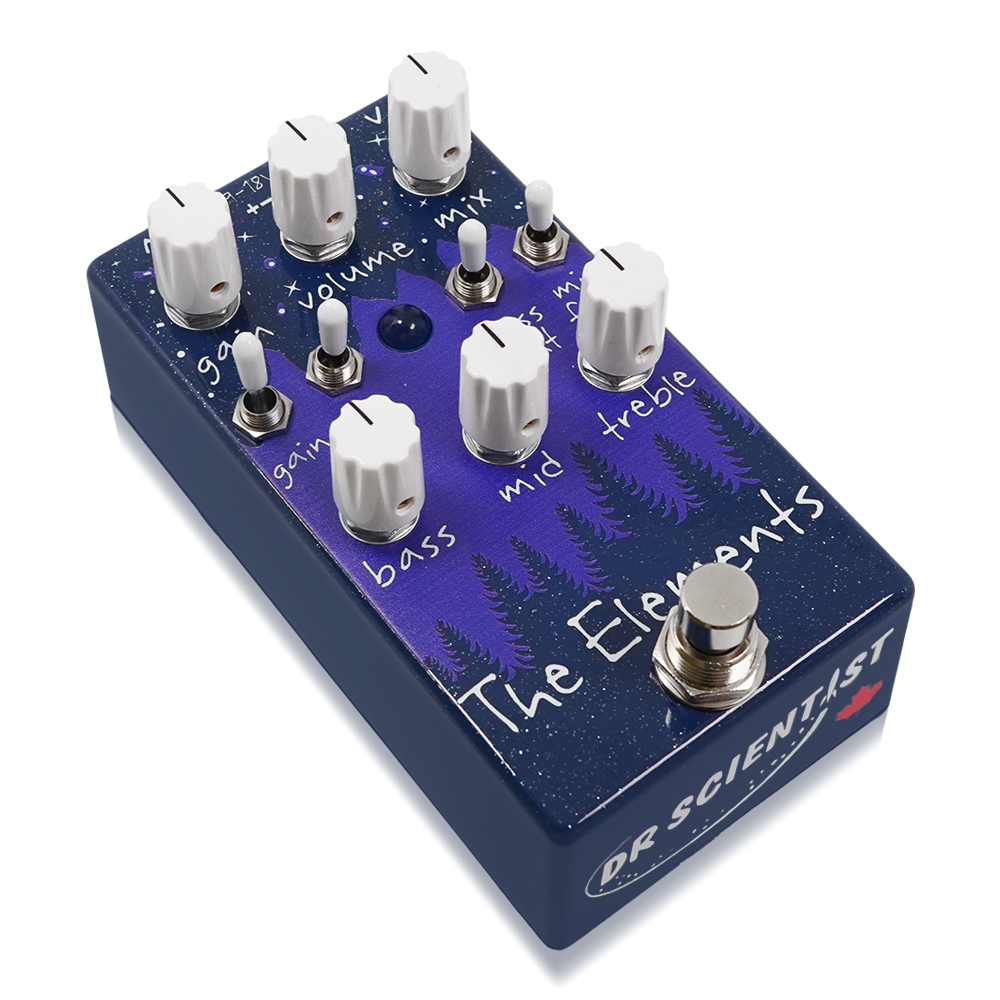Dr. Scientist The Elementsは、広いゲインレンジと3バンドEQを搭載したデュアルチャンネルのオーバードライブ・ディストーションペダルです。