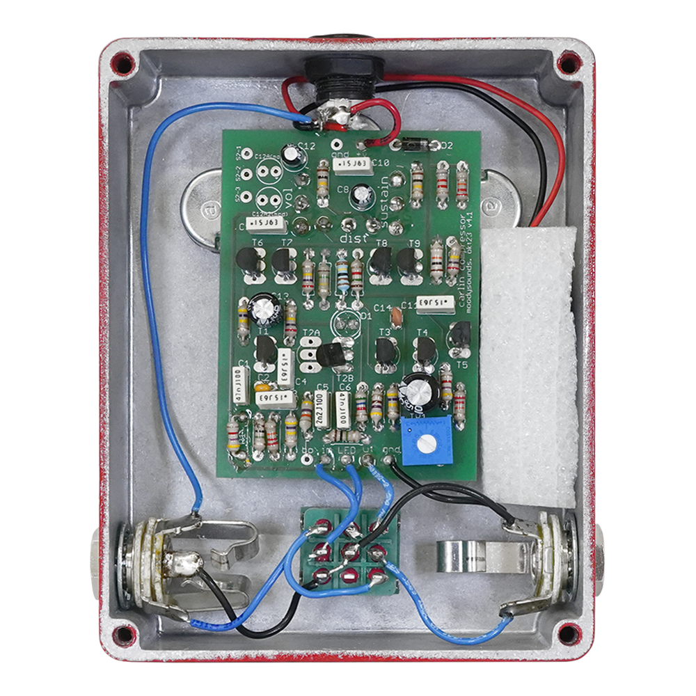 Moody Sounds Carlin Compressor Cloneは、1970年に開発されたCarlin Compressorと同じ回路で作られています。全てのコンポーネンツもオリジナルで使用されていたものが現在も生産されているため、同じものを仕様しています。これは開発者のニルスオロフ・カーリンも確認しています。